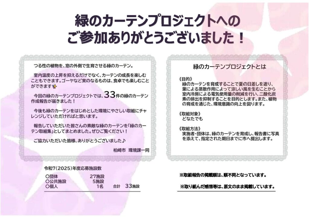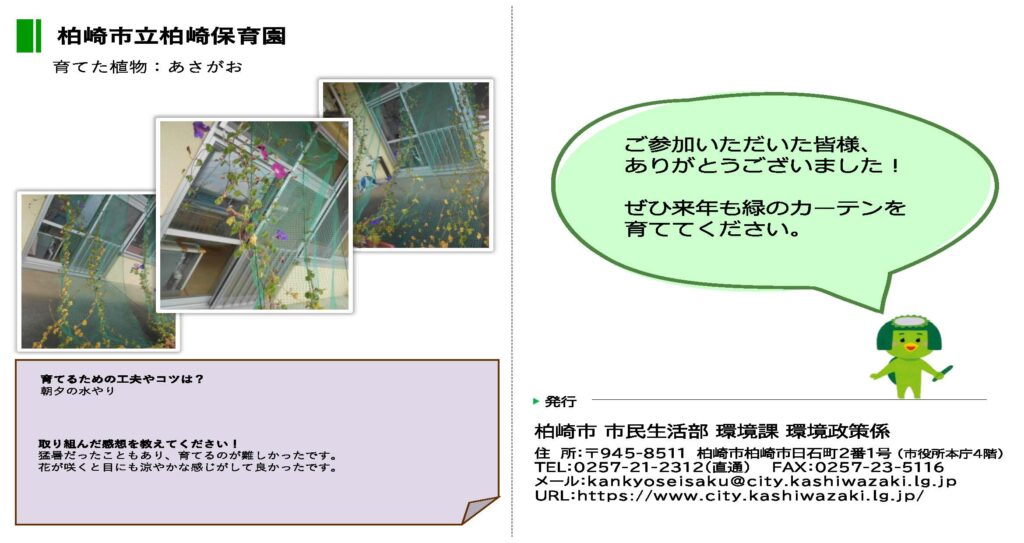 柏崎軍では、4月~9月の期間で『緑のカーテンプロジェクト』を実施しました。参加された皆さんの取り組みの様子をまとめた『緑のカーテン取組集』を作成しましたので、ぜひご覧ください!